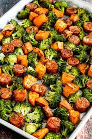 - Combine Ingredients: In a large mixing bowl, combine the diced sweet potatoes, sausage, and broccoli florets.
